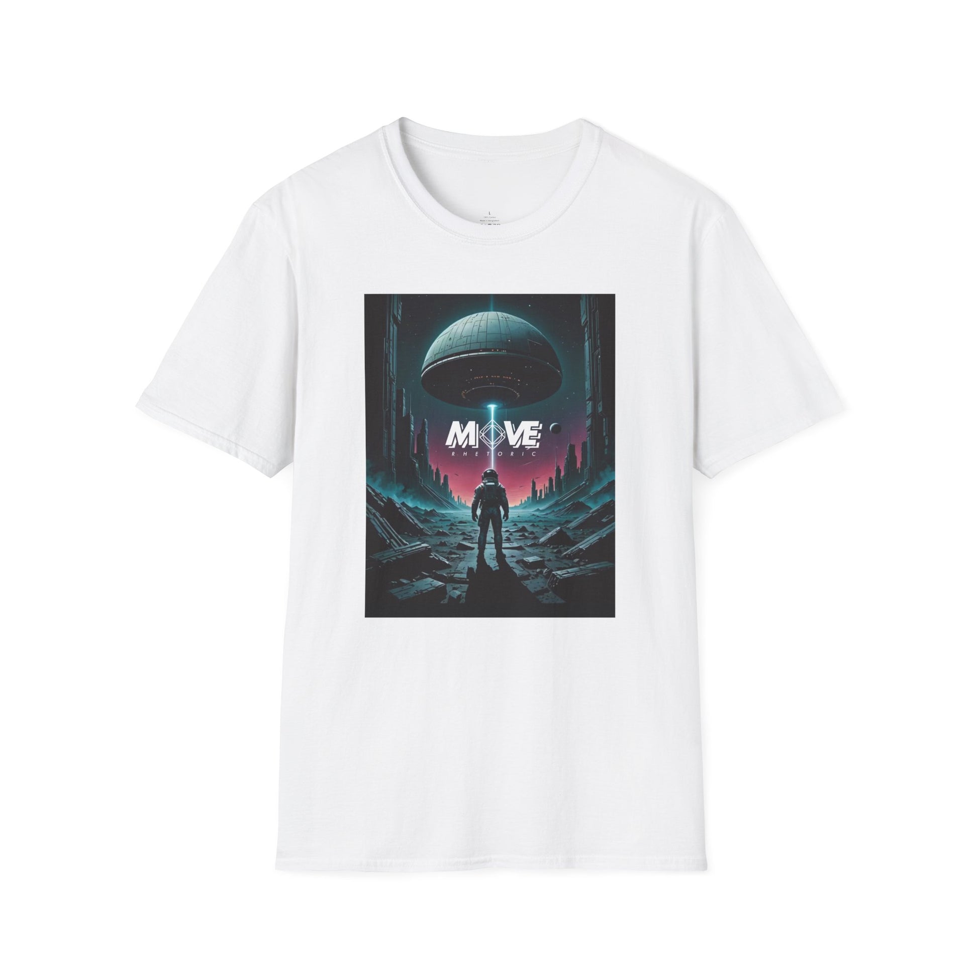 A lightweight, ring-spun cotton tee designed for those who move through life with curiosity, courage, and an open road mindset. Stretching across the chest is a cinematic, retro-futuristic scene: a lone wanderer standing beneath a massive hovering craft, set against a neon-lit alien horizon. It’s a visual story of exploration, independence, and that quiet moment before you take your next leap into the unknown.